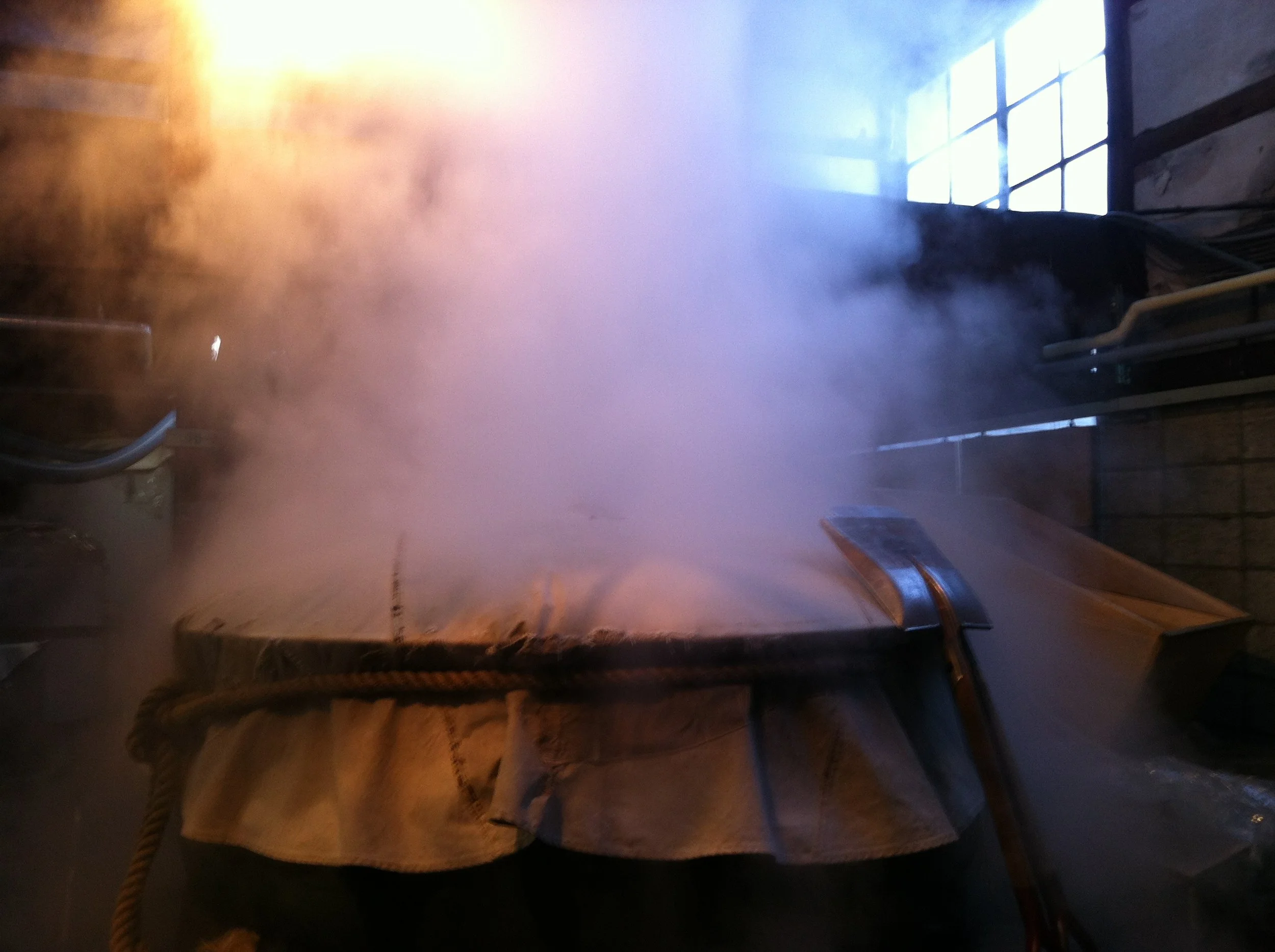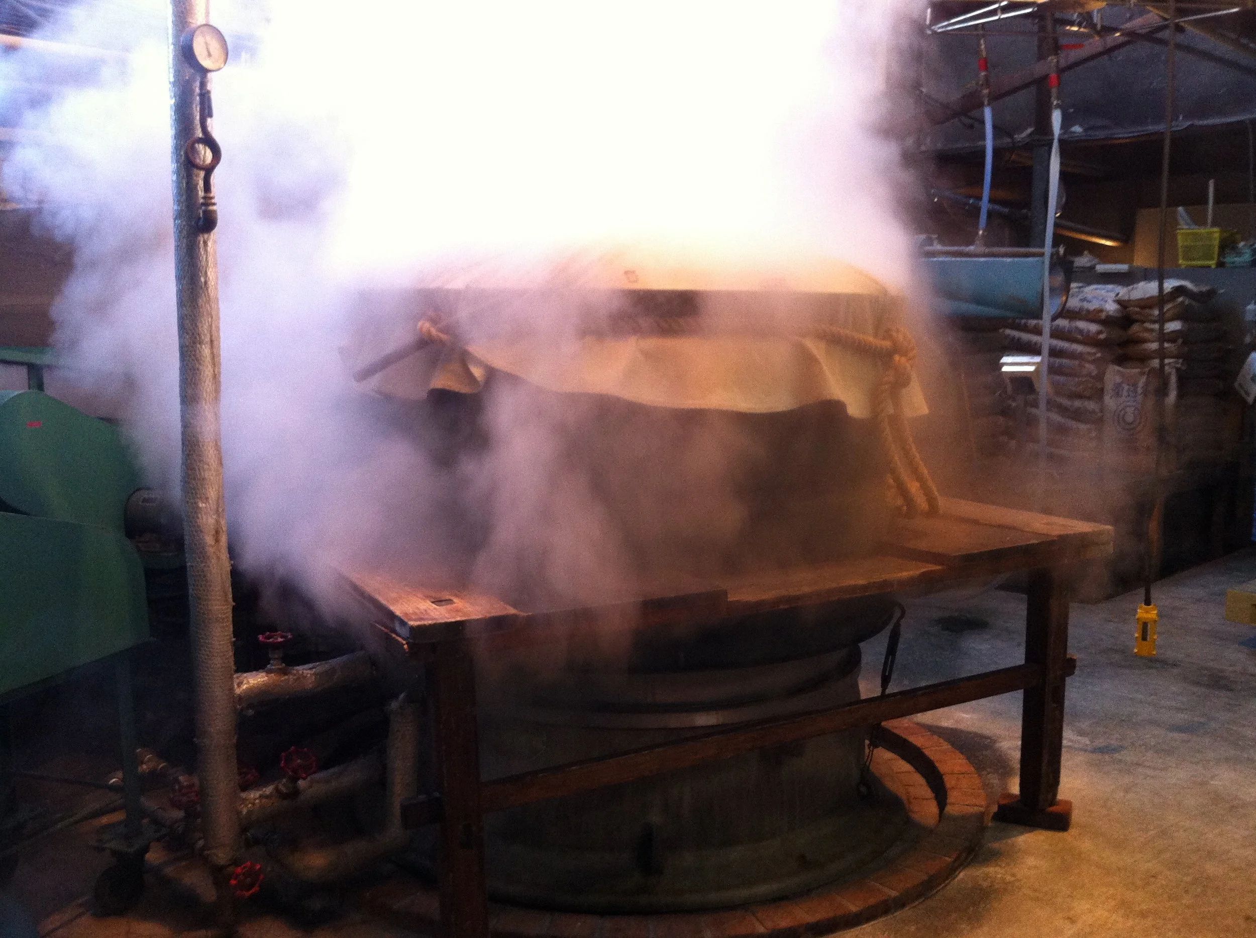 The steaming process takes approximately one hour utilizing a Koshiki basket steamer. Koshikis are typically a 3:1 ratio Width/Height, allowing the weight of the rice to be broadly distributed; and allowing for more efficient loading and unloading. Although not technically a pressure cooker, koshiki’s utilize a canvas cover tightly strapped over the top which “tents” the entire batch and enables the steam to more uniformly penetrate the rice grains.